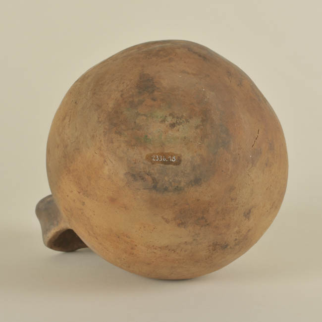 Vasija simétrica de cuerpo globular, de estructura restringida con cuello y perfil inflectado. Labio redondeado, borde evertido, cuello hiperboloide, cuerpo esférico y base plana. Posee un asa cinta de sección elipsoidal que nace bajo el borde y se extiende hasta donde comienza el cuerpo. Superficie alisada de color café claro.