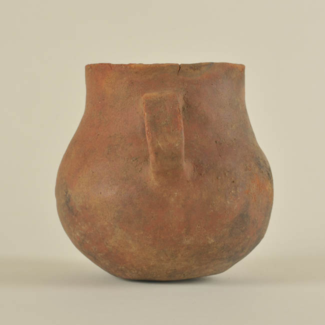 Vasija simétrica de cuerpo globular, de estructura restringida con cuello y perfil inflectado. Labio redondeado, borde recto, cuello hiperboloide, cuerpo esférico y base plana. Posee un asa cinta de sección elipsoidal que nace en el cuello y se extiende hasta donde comienza el cuerpo. Superficie pulida con engobe rojo.