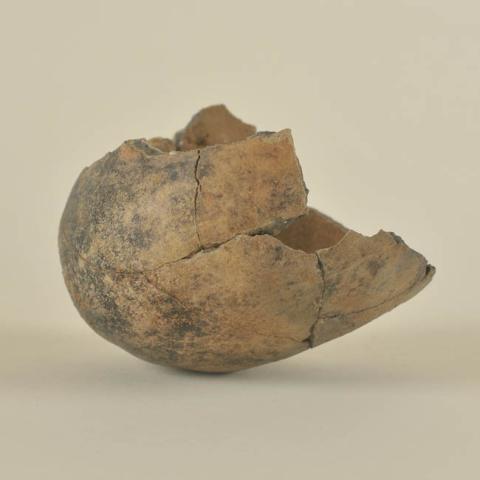 Vasija simétrica de cuerpo globular de cuerpo esférico y base cóncava, elaborada en cerámica de color tierra. Falta la mitad de la pieza.