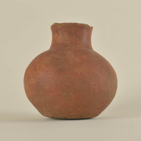Vasija simétrica de cuerpo globular de estructura restringida con cuello y perfil compuesto. Labio redondeado, borde evertido, cuello hiperboloide, cuerpo esférico y base plana. Posee un asa cinta que nace bajo el labio y se extiende hasta donde comienza el cuerpo. Superficie pulida con engobe rojo. En la parte inferior del cuello, donde se une con el cuerpo, posee dos líneas incisas paralelas que recorren toda la pieza.