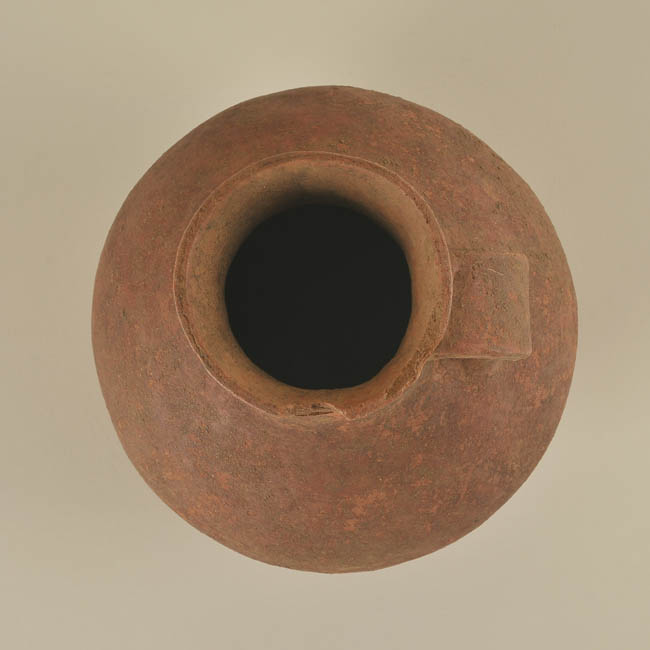Vasija simétrica de cuerpo globular, de estructura restringida con cuello y perfil inflectado. Labio plano, borde recto, cuello hiperboloide, cuerpo esférico y base plana. Posee un asa cinta de sección rectangular que nace bajo el borde y se extiende hasta donde comienza el cuerpo. En la unión del cuello con el cuerpo presenta un abultamiento que recorre toda la pieza. Superficie pulida con engobe rojo.