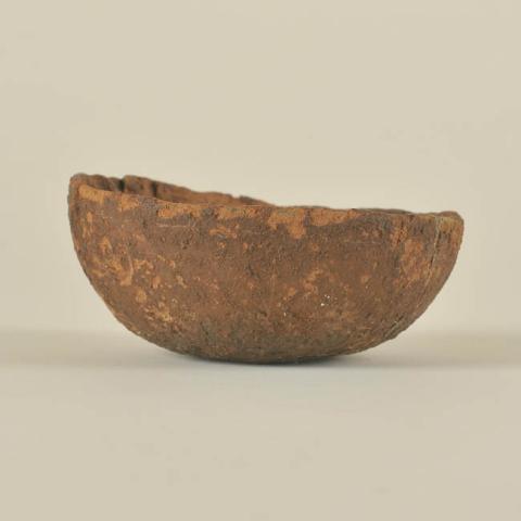 Vasija simétrica de estructura no restringida de perfil simple. Labio redondeado borde invertido, cuerpo esférico y base plana. Superficie de color café.
