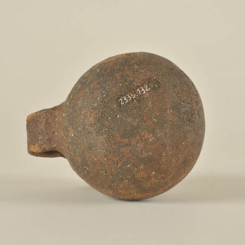 Vasija simétrica de cuerpo cilíndrico, de estructura restringida con cuello y perfil compuesto. Labio redondeado, borde recto, cuello cilíndrico y base plana. Posee un asa cinta de sección rectangular que nace en el cuello y se extiende hasta el comienzo del cuerpo. Superficie alisada de color café.