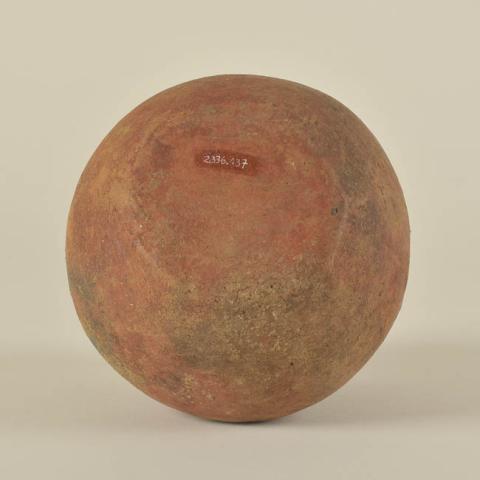 Vasija simétrica de cuerpo globular, de estructura restringida con cuello y perfil inflectado. Labio redondeado, borde evertido, cuello hiperboloide, cuerpo esférico y base plana. Posee un asa cinta de sección elipsoidal que nace en el cuello y se extiende hasta el comienzo del cuerpo. Superficie pulida con engobe rojo.