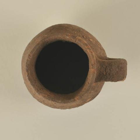 Vasija simétrica de cuerpo globular, de estructura restringida con cuello y perfil compuesto. Labio plano, borde evertido, cuello cilíndrico, cuerpo esférico y base convexa. Posee un asa cinta de sección subcircular que nace en el cuello y se extiende hasta el comienzo del cuerpo. Presenta una línea incisa en la unión del cuello con el cuerpo que recorre toda la pieza. Superficie de color café.