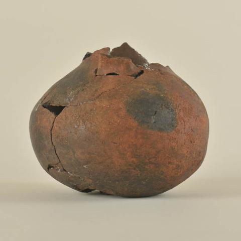 Vasija simétrica de cuerpo globular, de estructura restringida con cuello y perfil inflectado. Cuerpo esférico y base plana. Posee un asa cinta de sección rectangular que se extiende hasta donde comienza el cuerpo. Superficie de color café.