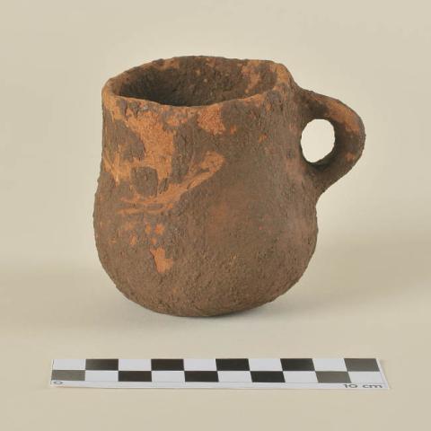 Vasija simétrica de cuerpo globular de estructura restringida con cuello y perfil inflectado. Labio redondeado, borde invertido, cuello cilíndrico, cuerpo esférico y base cóncava. Posee un asa cinta de sección elipsoidal que nace bajo el borde y se extiende hasta donde comienza el cuerpo.