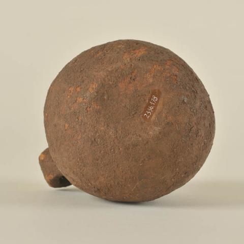 Vasija simétrica de cuerpo globular de estructura restringida con cuello de perfil inflectado. Labio plano, borde invertido, cuello cónico, cuerpo esférico y base cóncava. Posee un asa cinta de sección rectangular que nace en la sección superior del cuello y se extiende donde comienza el cuerpo. Superficie de color café.