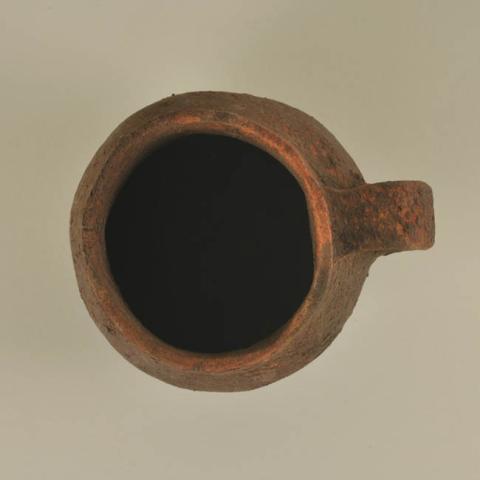 Vasija simétrica de cuerpo globular, de estructura restringida con cuello y perfil inflectado. Labio plano, borde recto, cuello hiperboloide, cuerpo esférico y base plana. Posee un asa cinta de sección elipsoidal que nace bajo el borde y se extiende hasta el comienzo del cuerpo. Superficie pulida de color café.