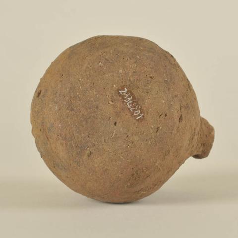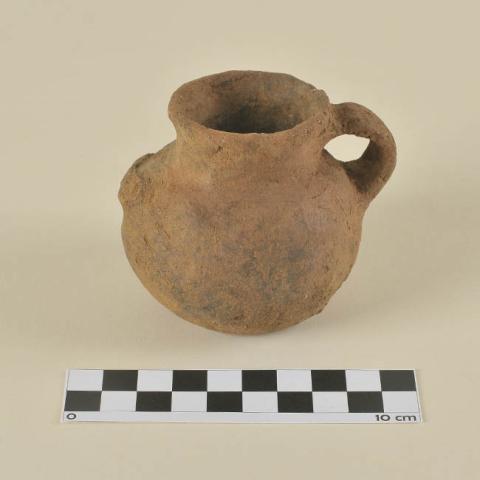 Vasija simétrica de cuerpo globular, de estructura restringida con cuello y perfil inflectado. Labio plano, borde evertido, cuello de tronco cónico, cuerpo esférico y base plana. Posee dos asas cintas de sección rectangular que nacen en el borde y se extienden hasta la parte superior del cuerpo. Superficie alisada de color café.
