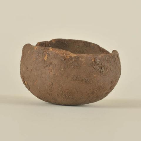 Vasija simétrica de cuerpo globular, de estructura no restringida y perfil simple. Labio redondeado, cuello invertido, cuerpo esférico y base convexa. Superficie alisada de color café.