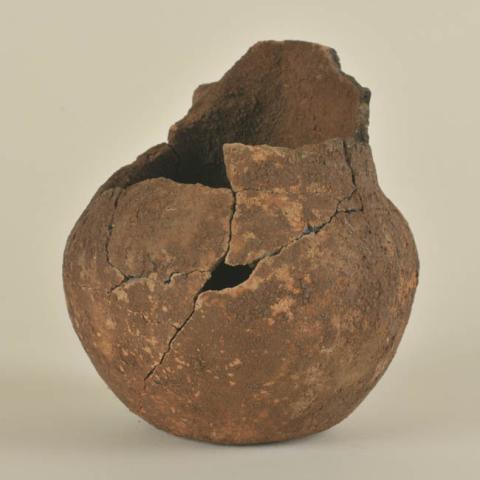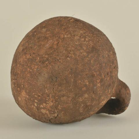 Vasija simétrica de cuerpo globular, de estructura restringida con cuello y perfil inflectado. Labio redondeado, borde evertido, cuello hiperboloide, cuerpo esférico y base cóncava. Posee un asa cinta de sección elipsoidal que nace en el cuello y se extiende hasta donde comienza el cuerpo. Superficie de color café.