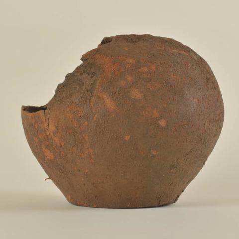 Vasija simétrica de cuerpo globular, de estructura restringida con cuello, y perfil inflectado. Labio plano, borde recto, cuello cilíndrico, cuerpo esférico y base plana. Superficie de color café.