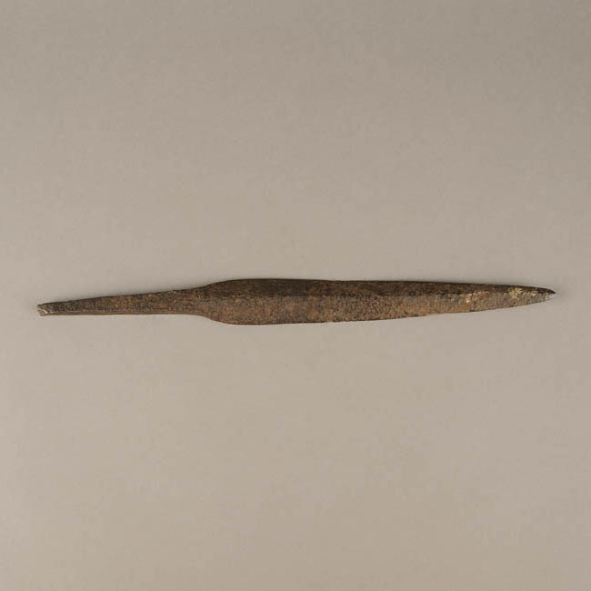 Arma blanca corto punzante de mano y tiro, compuesta de cubo y hoja. Cubo de hierro recto ensanchando en su parte superior. Hoja de hierro de doble filo de forma triangular terminada en punta aguzada.