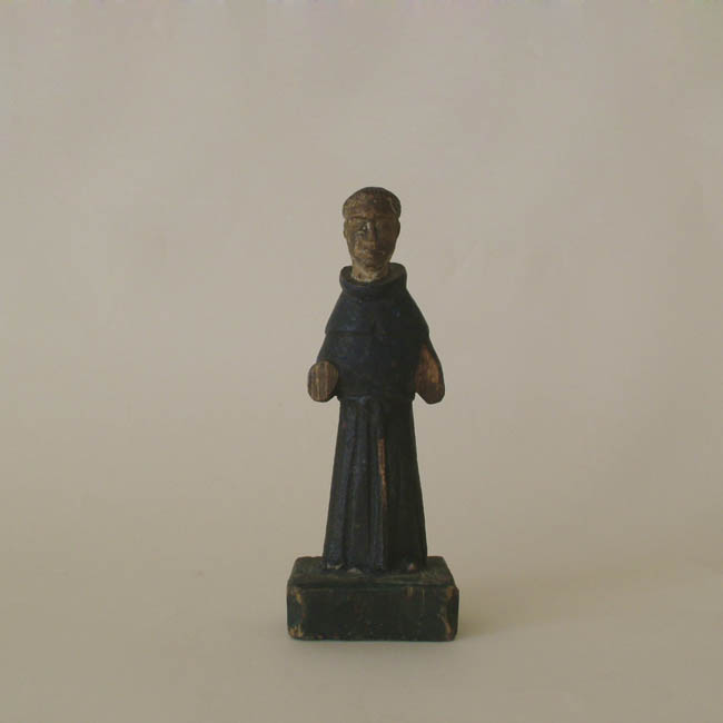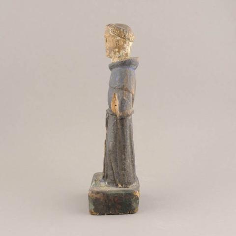 Figura tridimensional que aborda un personaje masculino propio de la religión católica, al parecer un franciscano. Elaborado completamente en madera a partir del tallado y policromado. El personaje presenta pelo corto estilo franciscano, con hábito conformado por una túnica color café, un cordón o cinturón y una capucha o cogulla (la parecer incompleta) de color levemente azulado. No presenta pies, sino un pedestal cuadrado. Le faltan las dos manos.