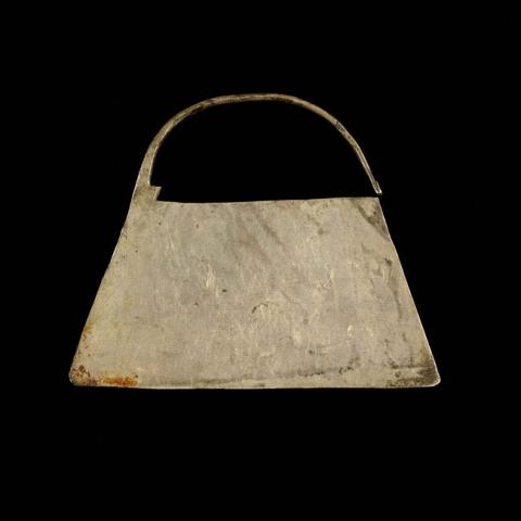 Par de adornos de alpaca de forma trapezoidal, de uso personal femenino en la cultura Mapuche, que se usa en el lóbulo de las orejas. Es una sola pieza, formada por un cuerpo trapezoidal realizado por laminado, que da paso a una toma superior semicircular abierta en un extremo, para insertarlo en la oreja. Esta doblada la punta con el objeto de que no tenga filo.