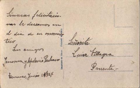 Objeto rectangular de orientación horizontal. Composición en base a una figura femenina inclinada sobre sus brazos. Lleva un vestido de color negro y se apoya sobre flores de color rojo. En el reverso hay texto manuscrito en dos columnas en tinta de color negro.