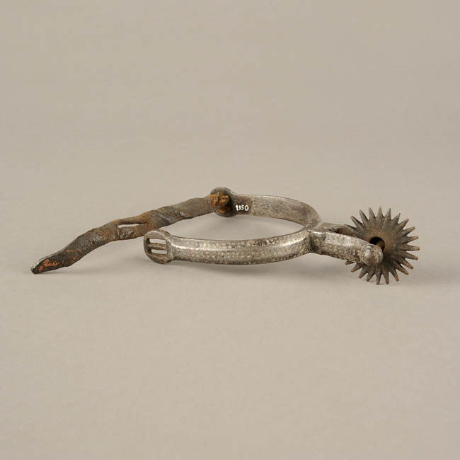 Objeto metálico, usado en pares, que se ajusta al talón del calzado para picar a la cabalgadura, compuesto por tres partes, un arco con decoraciones en bajorrelieve cuyos extremos abiertos terminan de forma redondeada con dos perforaciones y que de su centro sale un elemento rectangular (pihuelo), de forma recta, éste sujeta la rodaja, de forma circular y 24 púas concéntricas, mediante un pasador. Posee una correa de cuero en uno de los extremos del arco que servía de sujección.