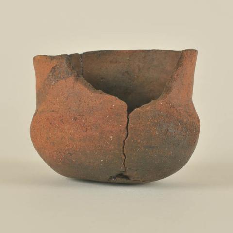 Vasija globular de estructura no restringida, de perfil compuesto de forma simétrica. El cuerpo es globular, labio plano, borde invertido, cuello cilíndrico, base plana. Presenta un asa cinta de sección elipsoidal que nace bajo en el cuello hasta conde comienza el cuerpo. Superficie pulida, color café.