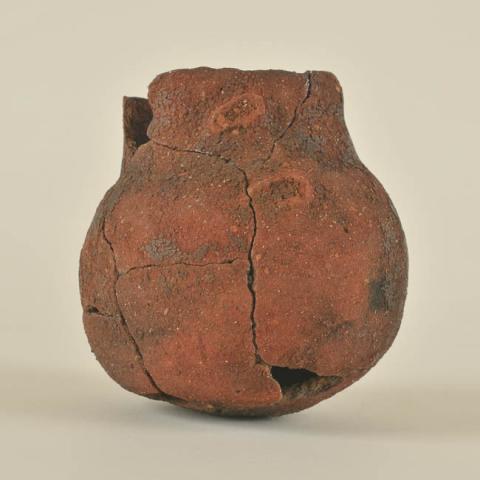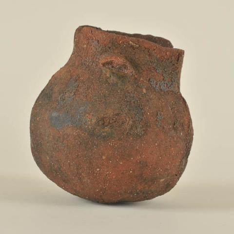 Vasija de cuerpo globular simétrica, de estructura restringida con cuello hiperboloide, de perfil inflectado. El cuerpo es esférico, labio biselado, borde invertido y base convexa. Presenta dos asas cinta de sección elipsoidal que nacen bajo el borde y se insertan en la sección superior del cuerpo. La superficie parece haber sido alisada y de color café.