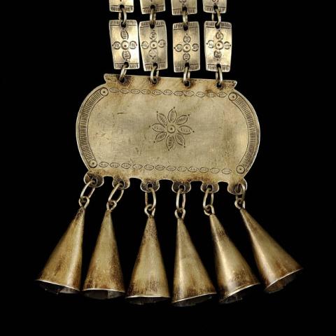 Objeto de forma rectangular oblonga, de uso personal femenino en la Cultura Mapuche. Compuesto por dos placas irregulares en cada extremo del objeto, una placa central y dieciséis placas rectangulares unidas por un total de treinta arandelas de alambre soldadas a la plata, decoradas por estampado en su parte central con un diseño floral. De la placa inferior penden cinco chollol, unidas a la placa mediante arandelas de alambre soldadas a la plata.
