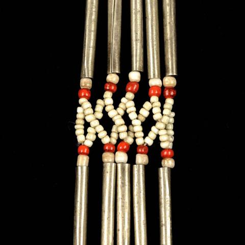 Objeto de forma rectangular oblonga, de uso personal femenino. Compuesto en su extremo superior, por 60 mostacillas de color azul y blanco, unidas por medio de hilos de algodón, conformando 5 hileras, a las que siguen 5 tubos de plata moldeados por percusión. A continuación se ubican un total de 93 mostacillas de colores blanco y rojo, de 2 tamaños diferentes, entrelazadas entre sí, para continuar con 5 tubos de plata unidos a 4 mostacillas de colores blanco y azul. Estas últimas, están unidas a una placa inferior de forma trapezoidal de alpaca que contiene un rostro fundido en su porción central. De la placa inferior penden 4 pin realizados con monedas de níquel del año 1933, cuyo valor era de un peso, por medio de arandelas de alambre soldadas a la plata.