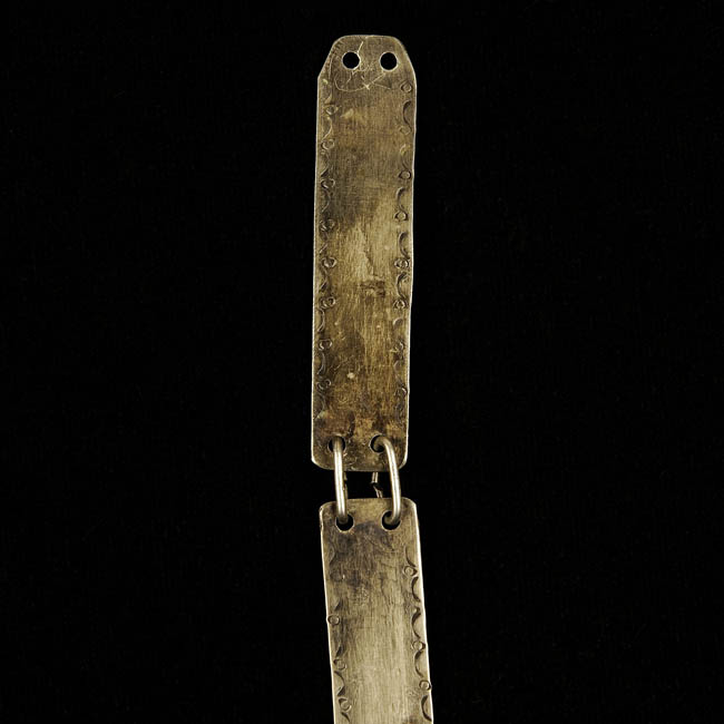 Objeto de forma rectangular oblonga, de uso personal femenino en la cultura Mapuche. Compuesta por 2 placas rectangulares y una figura de mujer realizada con la tecnica de fundido de la que penden 2 pin circulares. Las placas rectangulares poseen graficaciones por estampado circular y de semi luna.
