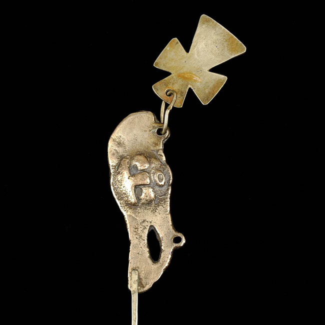 Objeto de forma rectangular oblonga, de uso personal femenino en la cultura Mapuche, como prendedor. Esta pieza está compuesta por tres partes: un cuerpo de alpaca que fue construido por técnica de fundido y que presenta un rostro en sobre relieve, además de un orificio irregular en un extremo y dos pequeños orificios en uno de sus lados, de uno de ellos pende un pin en forma de crucil, adozado al cuerpo mediante una arandela de alambre de alpaca soldada a la plata. Unida al cuerpo tiene una aguja de alpaca, por medio de una incision y posterior soldadura a la plata