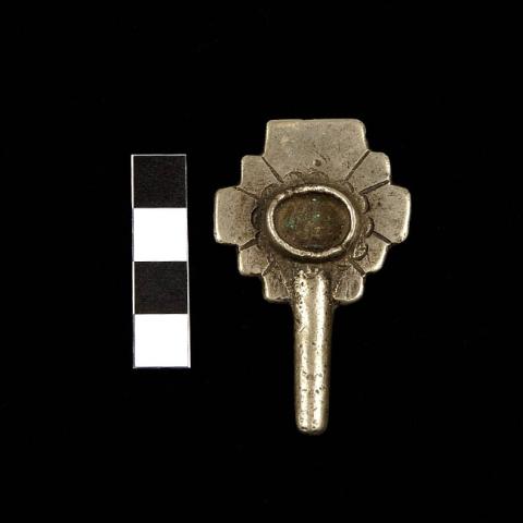 Artefacto fumatorio elaborado en plata y usado en contextos de ritualidad ceremonial, política y/o social de la cultura Mapuche. Está realizada con la técnica de fundido, posee un tubo de aspiración cilíndrico, plano en dos de sus lados, y un hornillo semiesférico en el centro de la pieza. La base del hornillo es escalonada y posee pequeños relieves semicirculares en el borde interior.