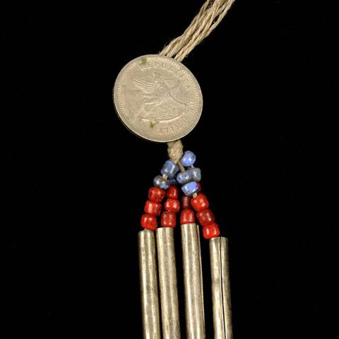 Objeto de forma rectangular oblonga, de uso personal femenino en la cultura Mapuche. Compuesto en el extremo superior por una moneda de 20 centavos de Níquel, la que tiene adherida una arandela de alpaca por medio de soldadura a la plata, desde la que penden 4 hilos fijados por medio de un nudo. Le siguen, en cada uno de los hilos, mostacillas rojas y celestes, ordenadas secuencialmente (20 en total), para continuar con 4 tubos de alpaca, uno en cada uno de los hilos. Siguiendo hacia abajo, se siguen otra serie de mostacillas de colores rojo y celestes (26), esta vez entrelazadas entre si para conformar un tejido de rombos, que continua en 4 tubos de alpaca. A continuación, se encuentra otra serie de mostacillas (8) de color rojo, seguida por una placa rectangular con decoraciones por estampado en la parte central, de la que penden 4 arandelas en forma de 8, todas soldadas a la plata, seguidas por 4 chollol de alpaca, soldados a la plata.