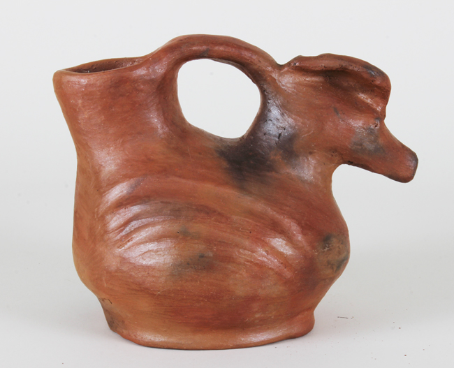Jarro zoomorfo asimétrico que imita la forma de una gallina doméstica. Es de cerámica y posee un asa central superior y boca posterior. Su superficie esta pulida y posee modelados e incisos. Su simbolismo se relaciona con las actividades y rol de la mujer mapuche.