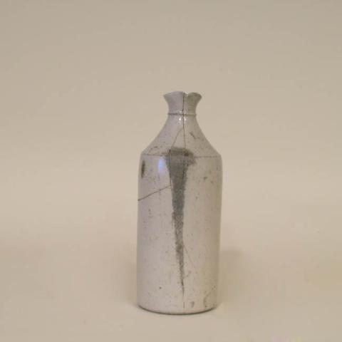 Contenedor de cerámica, usado para líquidos. De forma cilíndrica con base plana, de cuello trapezoidal invertido , cuello y labio evertido. Decoración tubular en sobre relieve ubicada entre el cuello y el labio. De superficie lisa, suave, de acabado brillante y de color blanco-gris.