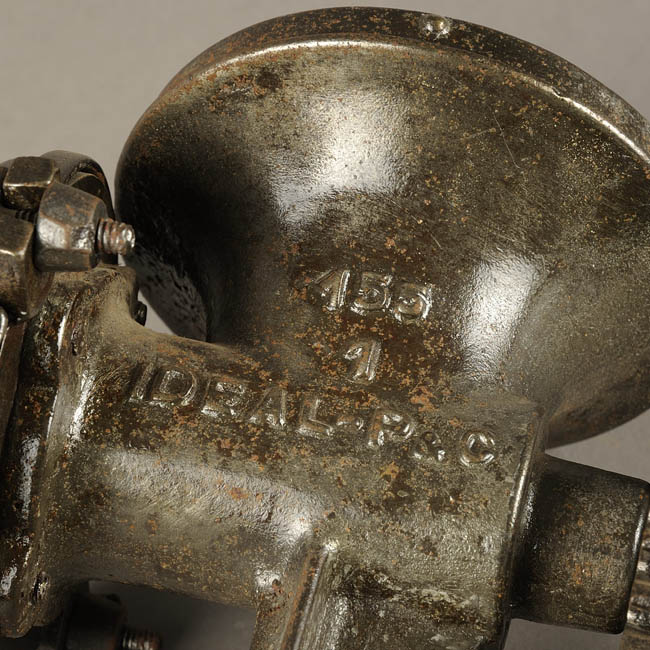 Objeto metálico de uso doméstico para triturar alimentos. Se compone de cuerpo metálico, engranajes y manivela. El cuerpo metálico se estructura por una boca ancha en la parte superior desde la cual se ingresan los alimentos; en su interior se encuentra el rodamiento con el cual se trituran los alimentos para ser expulsados por la boca lateral; y hacia la parte inferior está la prensa que funciona como sujetador en superficies planas. Los dos engranajes externos se ensamblan al cuerpo metálico y son de diferente tamaño, funcionan en conjunto con el rodamiento interior y la manivela. La manivela es ondulada y se encuentra reparada con soldadura cercana a su ensamble con el cuerpo metálico. La manivela posee mango horizontal de madera y al lado de la soldadura lleva en relieve el número "155". El cuerpo metálico lleva en un costado el relieve "155 // 1 // IDEAL-P&.C" y en la boca lateral, la cual presenta reparaciones en soldadura, lleva en relieve un cinta con las letras "IDEAL" y bajo la cinta en relieve el número "150 el cual se encuentra medianamente visible.