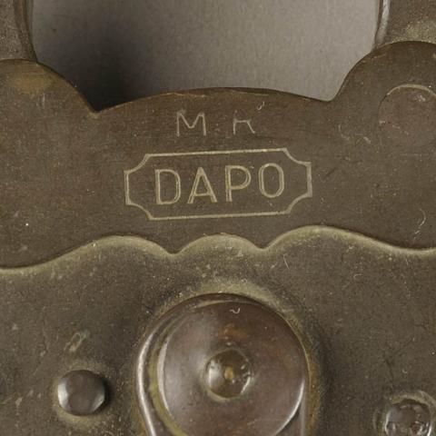 Objeto utilitario para asegurar objetos o espacios que pueden quedar cerrados y que es independiente a aquello que se cierra. Elaborado en metal, de cuerpo circular, sobre él lleva argolla móvil. En la parte superior del cuerpo circular lleva por el lado reverso y trasero placas, en la placa del frente lleva tallado la marca "M.R // DAPO". También en la superficie lleva la cerradura, la cual se encuentra protegida por tapa giratoria anexada a la superficie.