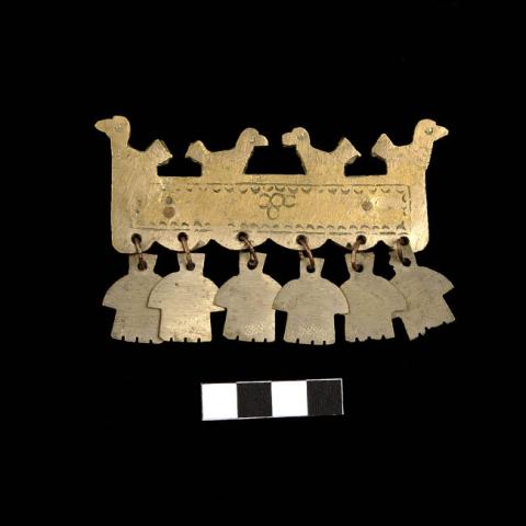 Objeto de forma rectangular oblonga, de uso personal femenino en la cultura Mapuche como prendedor. Posee una placa rectangular realizada por fundido de escoria metálica , la que posee en su borde superior formas de 4 aves que miran en direcciones opuesta. Posee tambien una grafucacion central con motico central y una línea que recorre todo el borde. Penden de ésta 6 pin de forma irregular, por medio de arandelas de alambre de cobre. Al reverso tiene adozado mediante soldadura, una arandela y una toma de cobre. Tiene además una gauja colocada a presión, realizada de alambre.