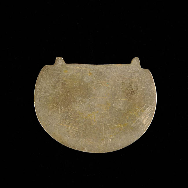 Par de adornos de alpaca de forma trapezoidal, de uso personal femenino en la cultura Mapuche, que se usa en el lóbulo de las orejas. Es una sola pieza de alpaca formada por un cuerpo semicircular realizado por laminado, que da paso a una toma superior semicircular abierta en un extremo, para insertarlo en la oreja. Posee graficaciones por estampado y burilado. A uno de los aros le falta la toma .