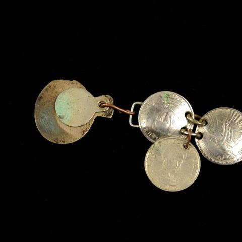 Objeto de forma rectangular, de uso personal femenino. Está compuesto por doce monedas de diferente época, ocho de las cuales están unidas de forma horizontal, formando una hilera de la que penden cuatro de menor tamaño. De uno de los extremos penden dos pines de alpaca de forma circular. Todas las partes están unidas por arandelas de alambre de cobre sin soldar, con excepción de las terminaciones de ambos extremos, que se encuentran soldadas a la plata. Este objeto se usa rodeando la muñeca .