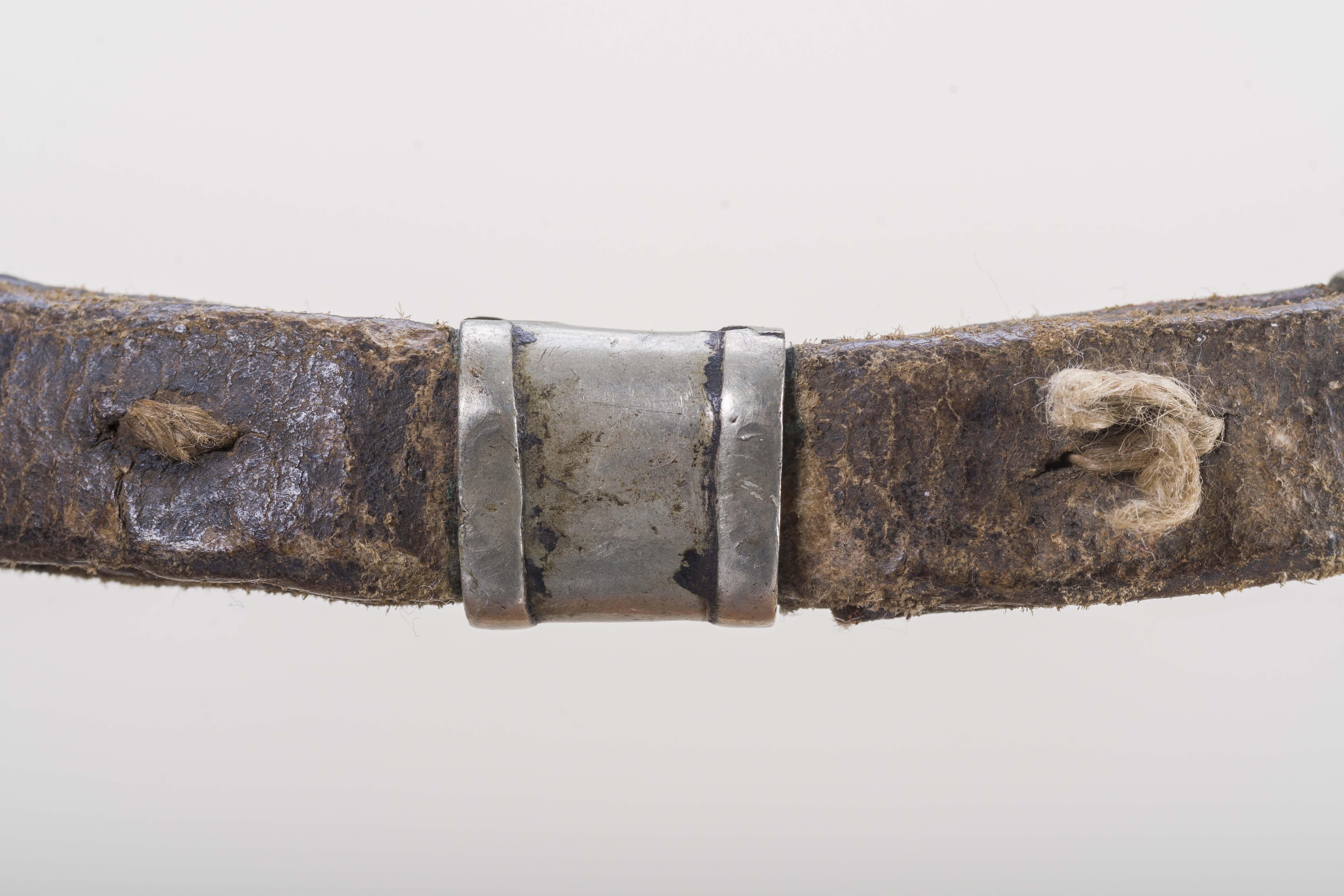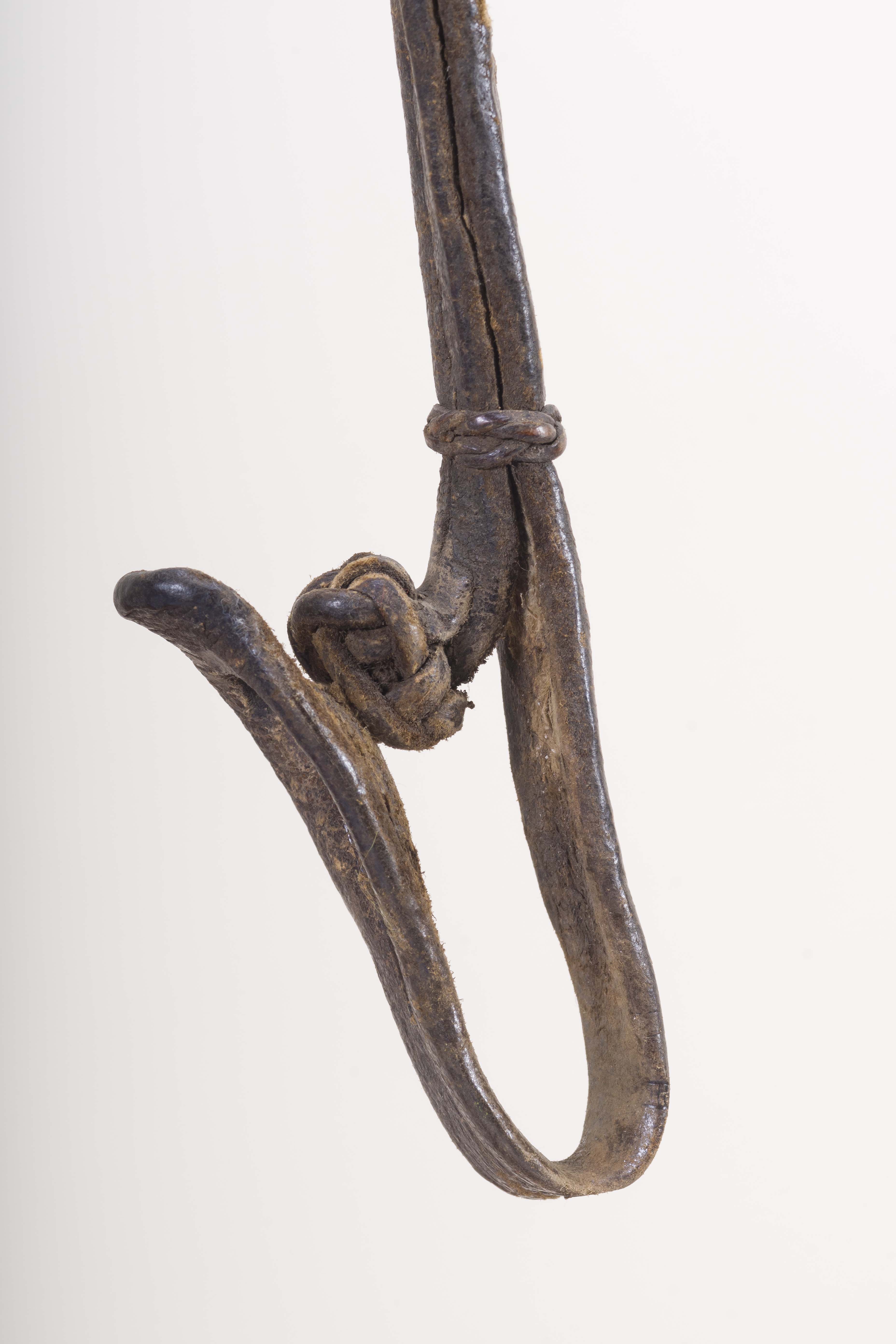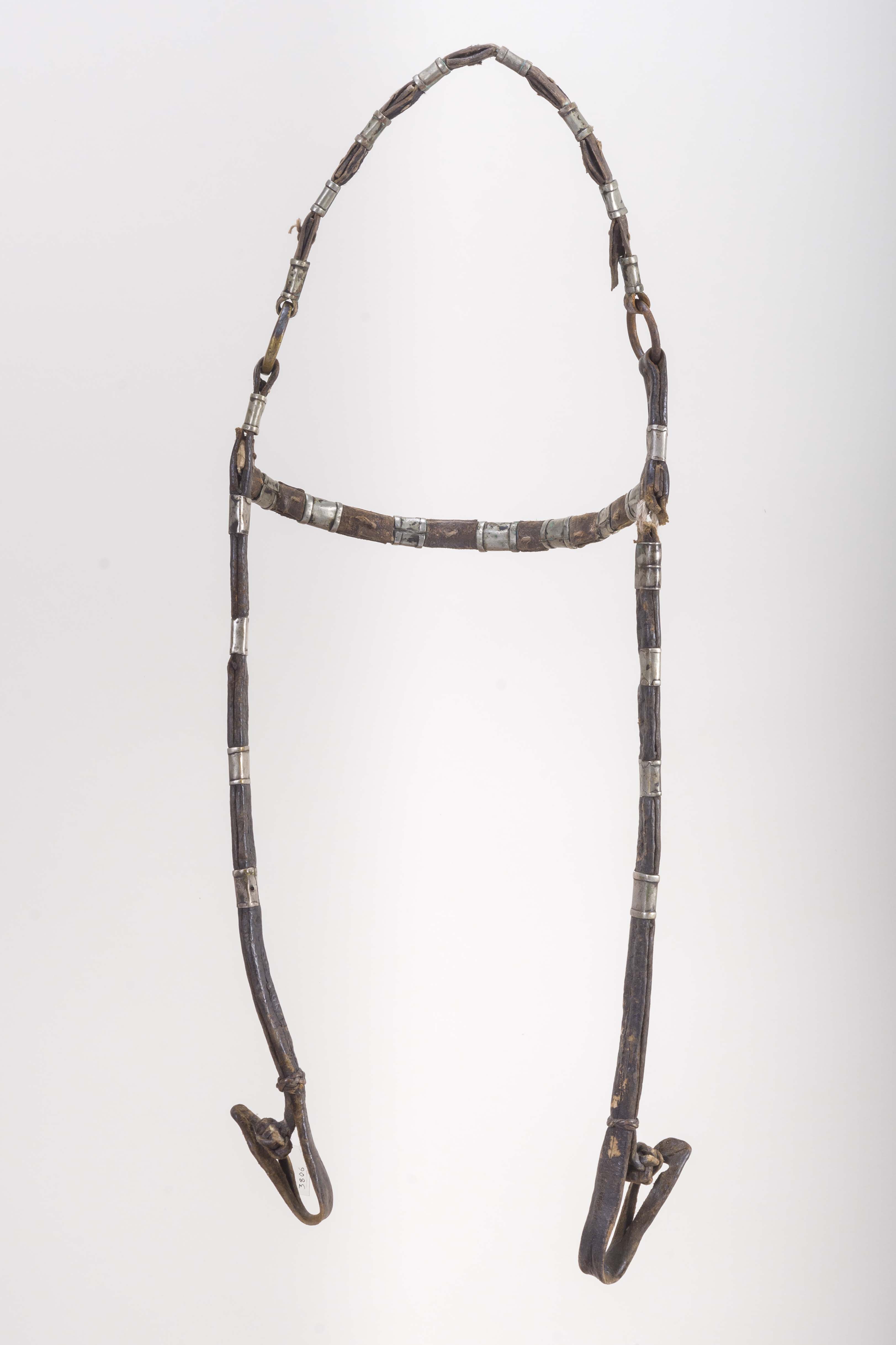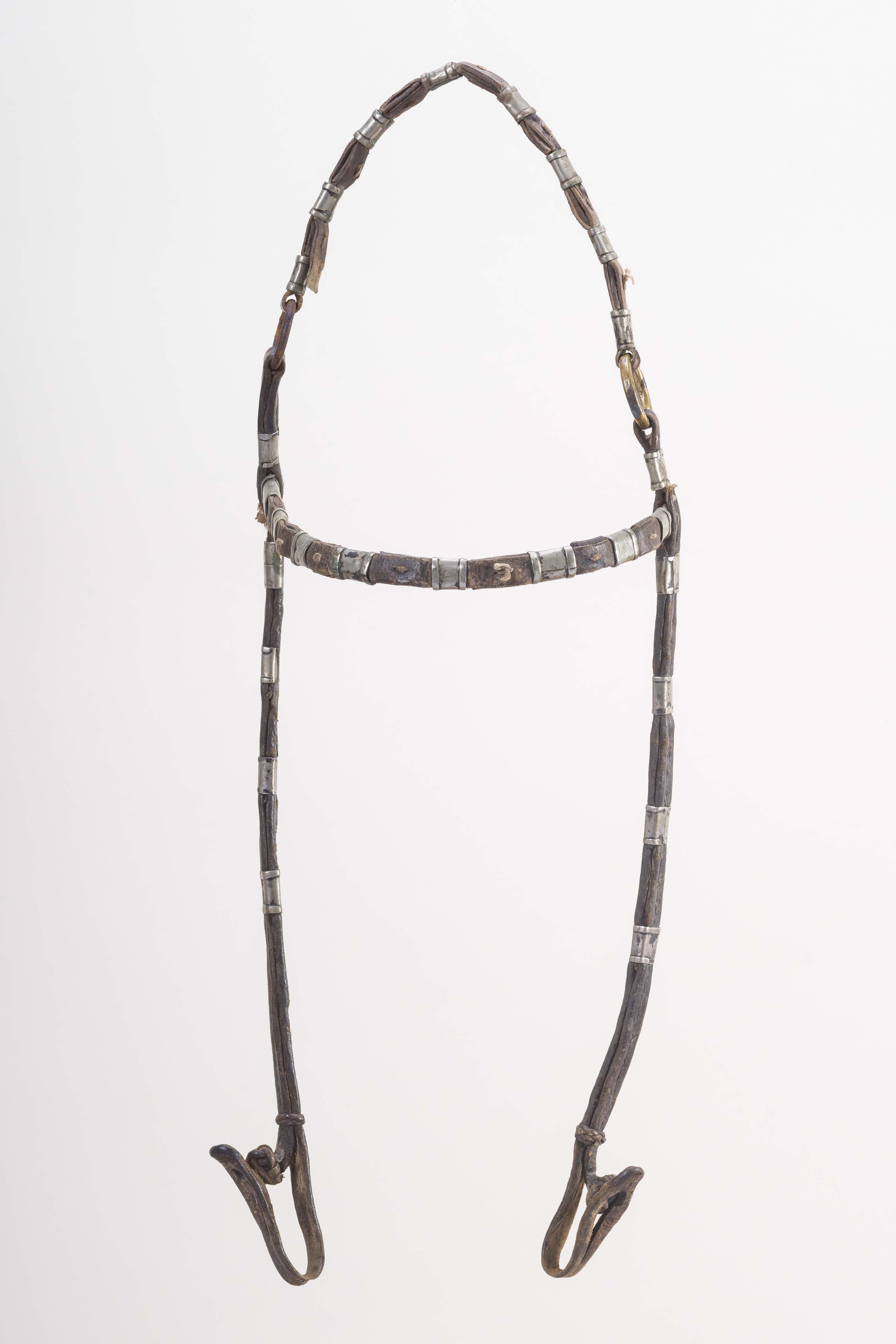 Está realizada con dos láminas de cuero cosidas entre sí y decoradas con cilindros de plata intercalados a manera de eslabones. En ambos extremos posee pieza de curo cosida a modo de asa en donde se inserta el freno por medio de una argolla metálica.