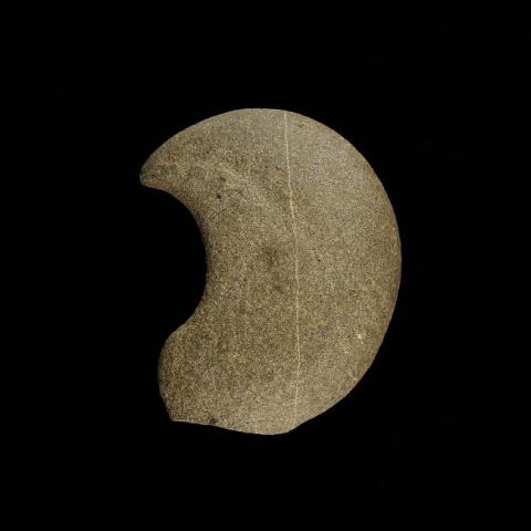 Bastón de mando elaborado en una pieza de piedra, consideradas como piedras de poder de significancia espiritual. De forma semicircular, de bordes redondeados , superficie alisada de color natural gris, sin decoraciones. No presenta el mango que le corresponde a este tipo de piezas.