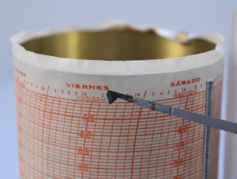 Su funcionamiento se realiza por medio de la dilatación o contracción de un sensor en forma pletina enrollada, la que mueve una palanca que mueve un brazo con una pluma en su extremo que se rellena con tinta y que va marcando una línea continua en una tarjeta de papel impreso que se sujeta al cilindro por medio de un clip.