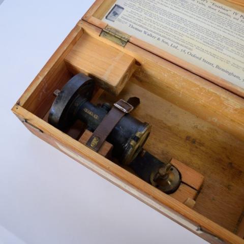 Este instrumento cuenta con una caja de transporte de madera con una etiqueta en el interior con las instrucciones de uso.