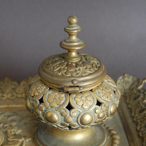 Está formado por una base de bronce en forma de bandeja de bordes lobulados y ricamente decorada con motivos vegetales. Sobre ella, hay dos contenedores del mismo material y decoración, usados para contener la tinta. Cada un o de estos recipientes tienen una tapa abisagrada rematada por un tomador torneado.