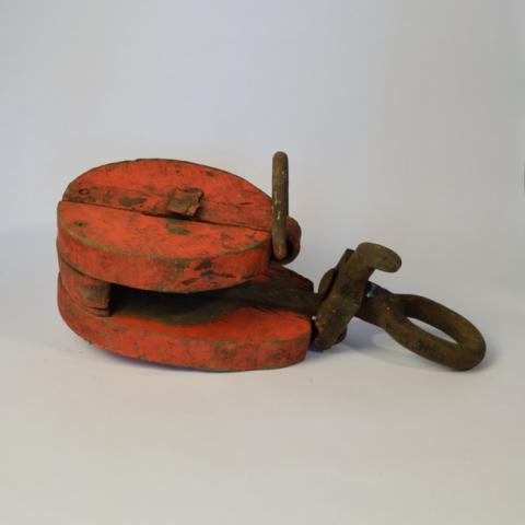 Objeto en forma de prisma de base ovalada con un cáncamo giratorio en su extremo. Está compuesto por dos piezas de madera pintada de naranja llamadas quijadas y que al ensamblarse de forma paralela dejan un espacio entre sí llamado cajera, que sirve para instalar una roldana que gira libremente por medio de un eje o pasador.