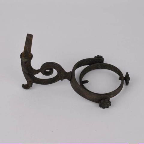 Objeto articulado compuesto por un soporte en forma de voluta decorada con hojas de acanto y una espiga de sección cuadrada, la que sirve para encajarla en un soporte u otra estructura adosada a la pared.