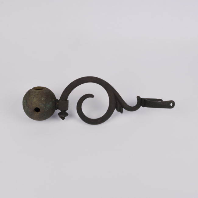 Objeto articulado compuesto por un soporte en forma de voluta en forma de rama con un brote y sujeta por un extremo a una esfera con cinco orificios, los que se presumen son los calzos para ensamblar otros brazos y el anclaje al techo.