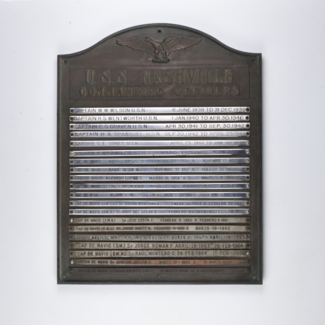 Estas placas estuvieron instaladas a bordo del crucero de la Armada de los Estados Unidos, USS CL 43 Nashville, en servicio entre 1938 y 1946. Adquirido por Chile, estuvo en servicio en su Armada como CL 03 Capitán Prat.
