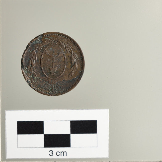 Pieza de metal acuñado para ser usado dinero. En el anverso tiene una inscripción orlada de dos ramas de laurel y en el reverso, un escudo heráldico formado por un óvalo cuyo campo está dividido en dos, la mitad superior con un achurado de líneas horizontales y la inferior, lisa; sobre el campo, dos brazos cuyas manos sostienen una cara con un gorro frigio sobre ella. Tras el campo ovalado, un sol radiante con rostro humano asomando su mitad superior. Todo el conjunto se encuentra orlado de dos ramas de laurel unidas con una cinta.