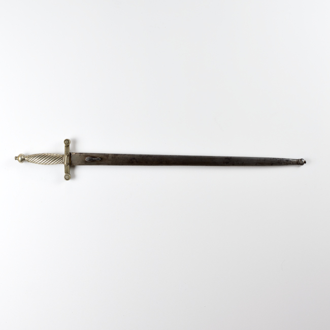 Arma blanca cortopunzante de mano, compuesta de empuñadura, guarda, hoja y vaina. La empuñadura es de plaqué o latón plateado, con un puño de superficie estriada en patrón helicoidal, pomo esférico y guarda en cruz, cuyos gavilanes están rematados en piezas circulares. En la cruz de la guarda tiene un ojal para fijar una dragona.