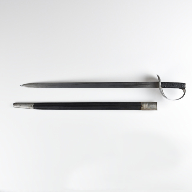 Arma blanca cortopunzante de mano, compuesta de empuñadura, guardamano y hoja. La empuñadura es de acero con dos cachas de madera forradas en cuero moleteado, remachadas a la espiga interior; la empuñadura está rematada posteriormente con un pomo redondeado. El guardamano es ligeramente cerrado, a partir de una chapa de acero con los bordes doblados hacia adelante.