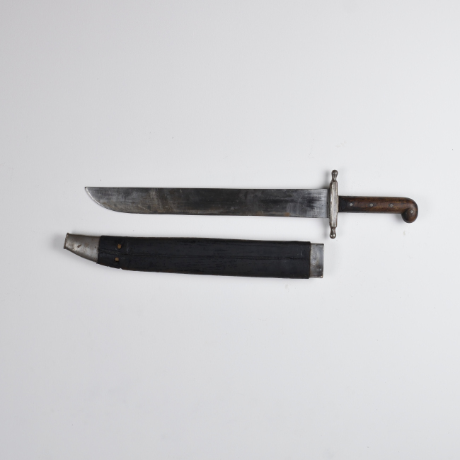 Arma blanca cortopunzante de mano compuesta de empuñadura, guarda, hoja y vaina. La empuñadura está formada por dos cachas de madera remachadas a una espiga de acero con un pomo redondeado y curvado hacia abajo. Tiene una guarda de acero en cruz con remates esféricos, la hoja es ancha y recta, de un filo, lomo plano, un vaceo por la cara derecha y la punta es diagonal, aguzada hacia el lomo.